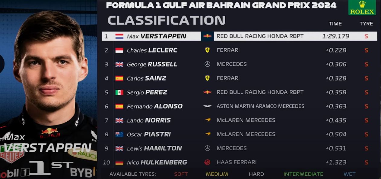 After 97 days, it’s time for Formula 1 qualifying in Bahrain. Max Verstappen took pole position in his RB20, followed by Charles le Clerc in the Ferrari. George Russell secured 3rd place in his Mercedes, while Sainz and Checo took 4th and 5th place, respectively.