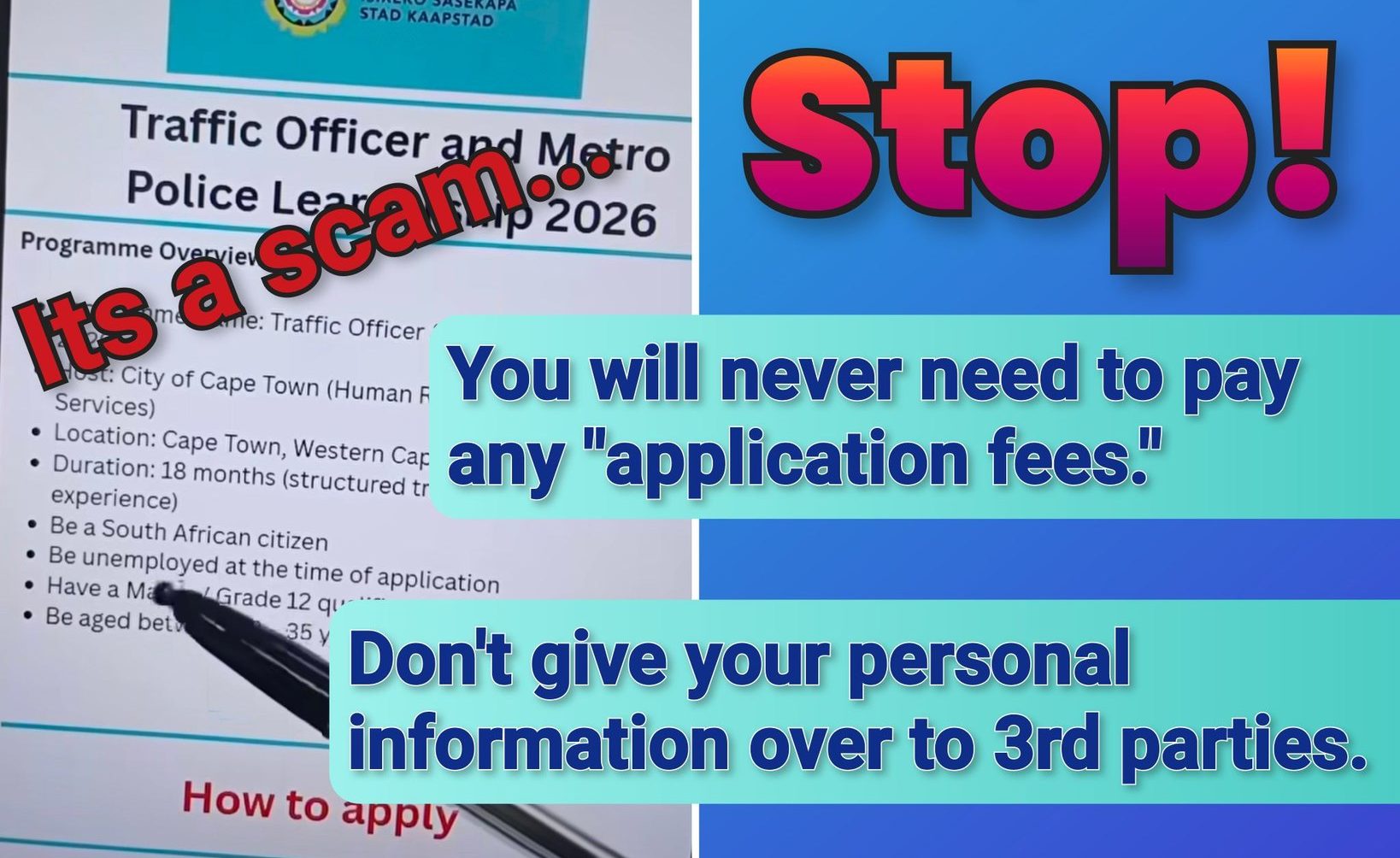 “A video circulating on social media is inviting applicants to register for employment opportunities within the City of Cape Town’s Safety and Security Directorate. This is a scam,” said Smith on a social media post.