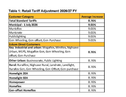 From 1 April, households and businesses who buy directly from Eskom will face an average 8.76% rise, while municipalities purchasing power will see a 9.01% increase from 1 July.