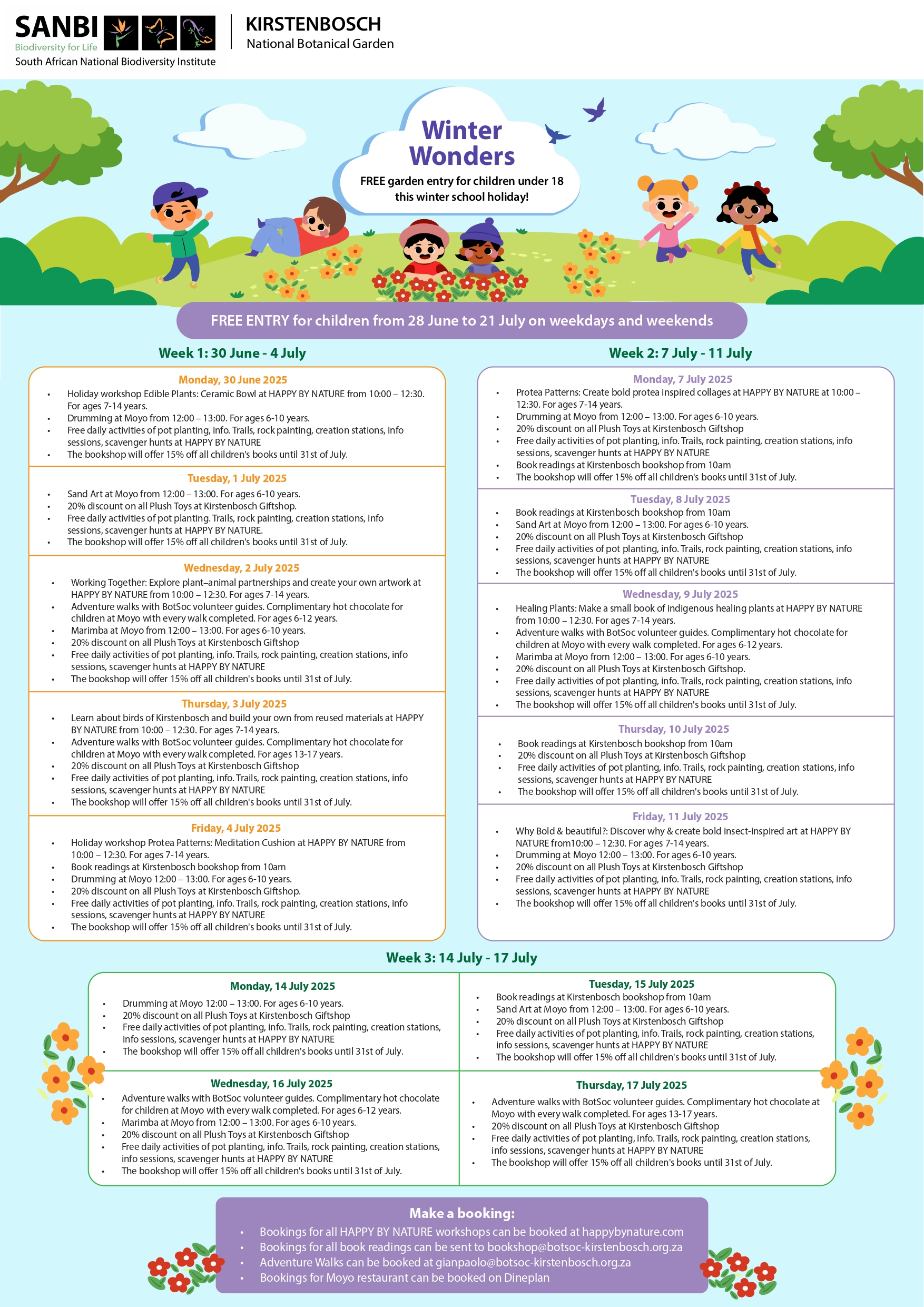 Kirstenbosch National Botanical Garden is transforming into a place of wonder this winter holiday, with all children under 18 enjoying free entry to the garden from 28 June to 21 July 2025.