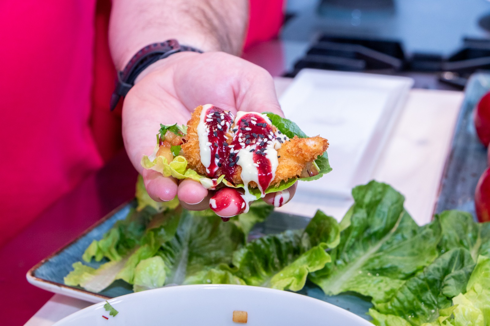 Wrap each prawn onto a lettuce leaf, spoon on some plum tartar, and the mayonnaise, chilli sauce and plum puree, roll it up and enjoy.