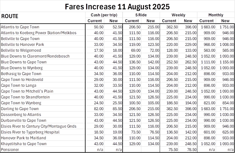 Commuters are encouraged to contact the Transport Information Centre on 0800 65 64 for a full list of revised fares, or visit gabs.co.za.