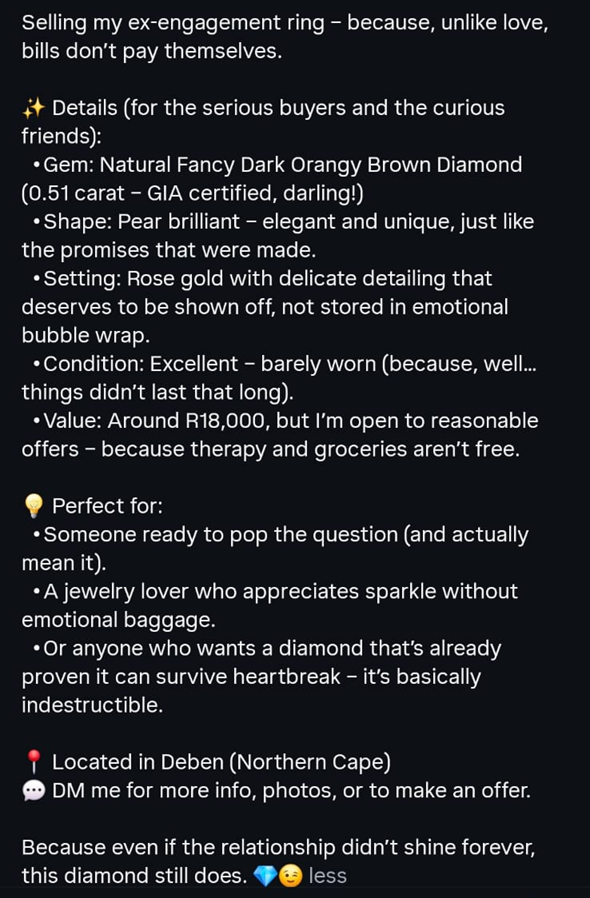 Lizemarie told us it took only a day for her to sell the engagement ring to someone. At least we know that she’s is at peace with the situation. Have a chuckle at her advert she posted on Instagram: