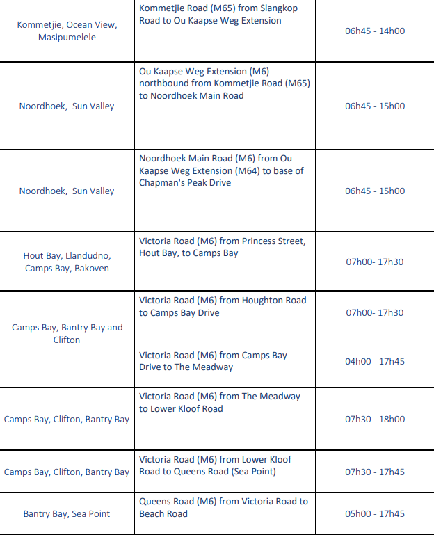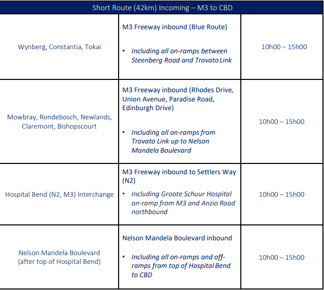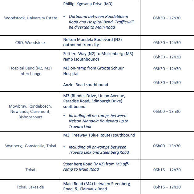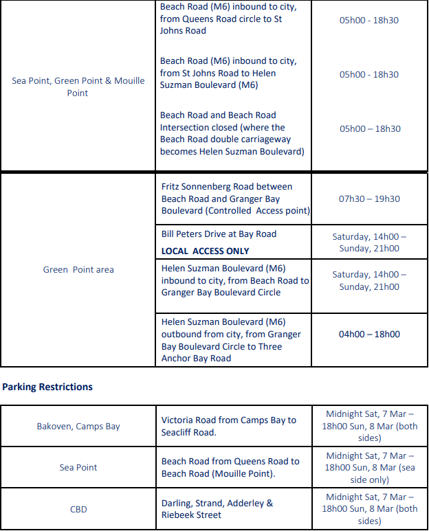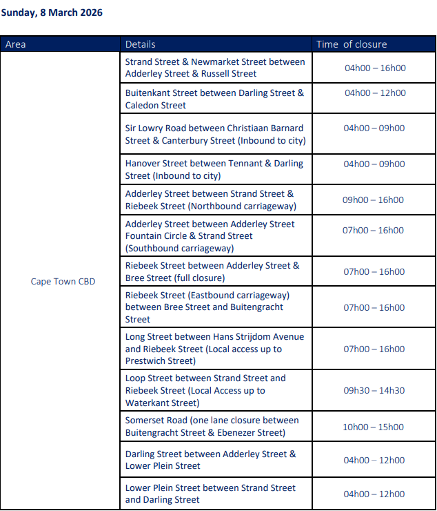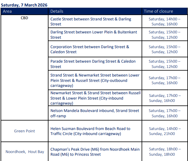 While minor road closures are in effect from today, Friday 6 March, hard closures will be in place on Saturday, 7 March and Sunday, 8 March 2026, particularly in the CBD, Green Point, Sea Point, Southern Suburbs and the Deep South.