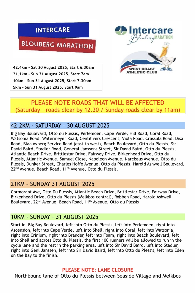 The Intercare Blouberg Marathon is taking place this weekend, 30 and 31 August, and the organisers have alerted road users to be aware of several roads that will be affected.