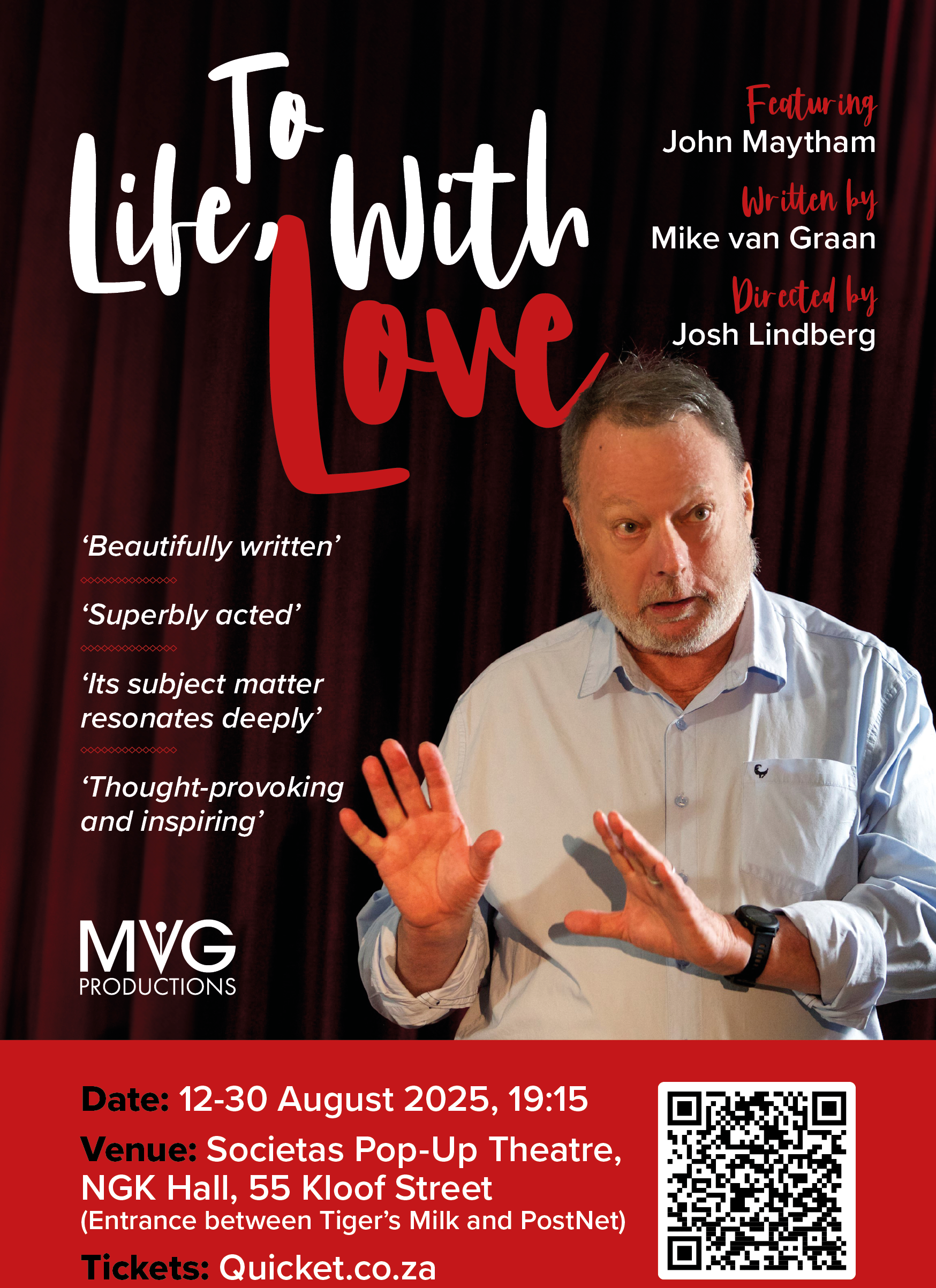You will be able to see the highly-regarded talk radio host and trained actor, John Maytham in the show, To Life, With Love, at the pop-up theatre Societas Theatre in Kloof Street, Cape Town, this month. Mike van Graan’s To Life, With Love returns due to popular demand.