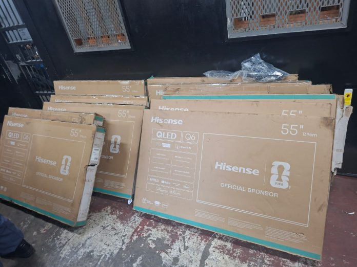 The suspects, aged between 18 and 25, were caught red-handed carting stolen television sets (TVs) after a truck was set alight near John Dreyer Road the day before.