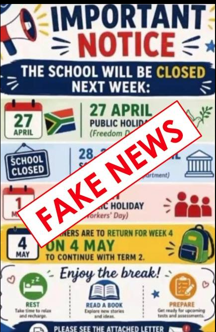 “These dates fall within the second term, from 8 April until 26 June, and are not designated as school or public holidays. According to the official 2026 calendar, 28, 29, and 30 April are normal school days. Learners are expected to be at school as planned.”
