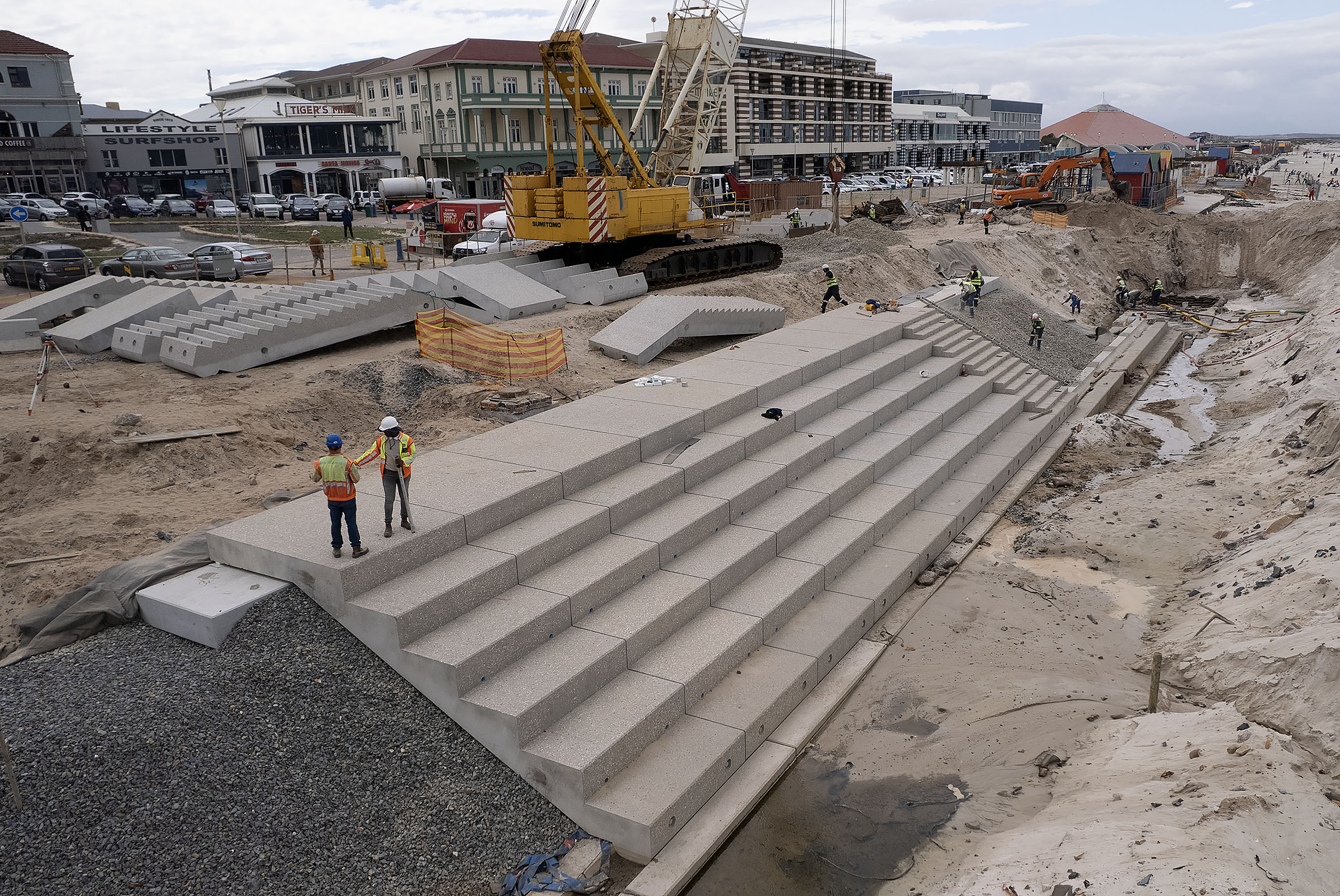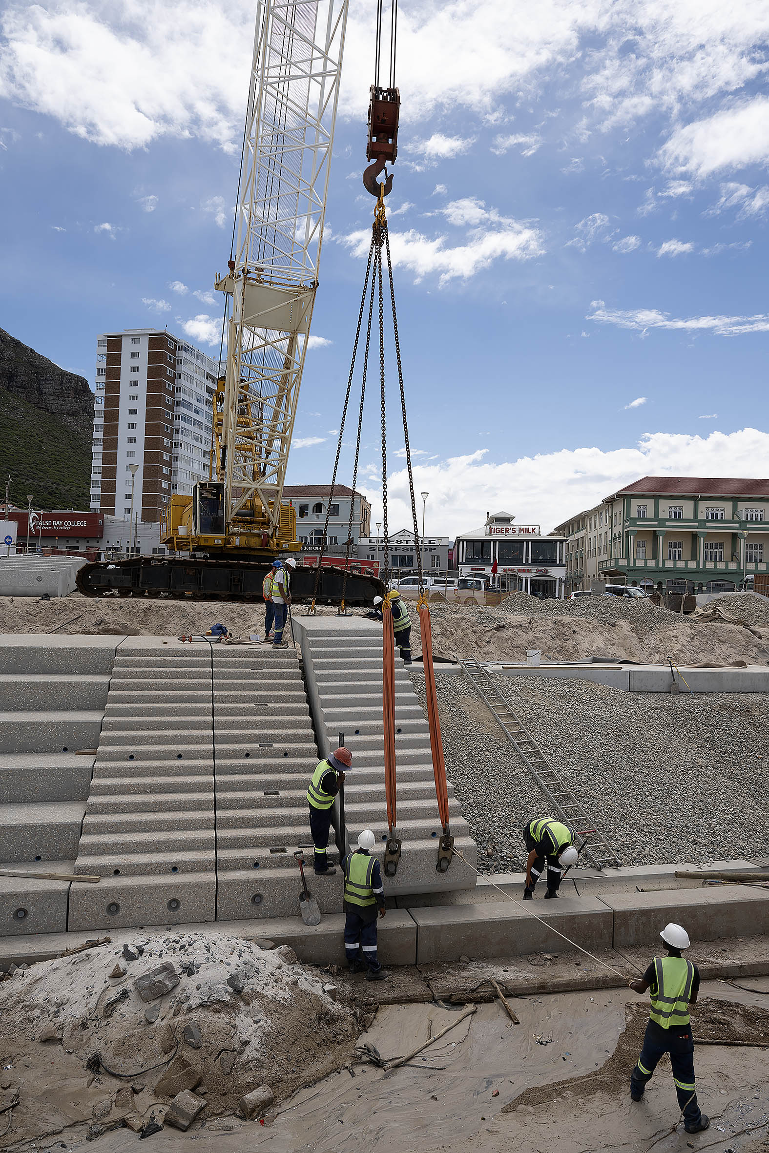 “The old ablution building was demolished in January, and currently, we are busy placing the precast concrete units that form the stepped revetment and promenade walkway. This work is ongoing on the western side of the beachfront, and visitors will see the huge crane operating in this area. I want to put residents at ease by mentioning that once this project is complete, most of the steps will be covered by sand. Thus, what will be visible to the naked eye once the project is complete will look a lot different from what is currently the case.”
