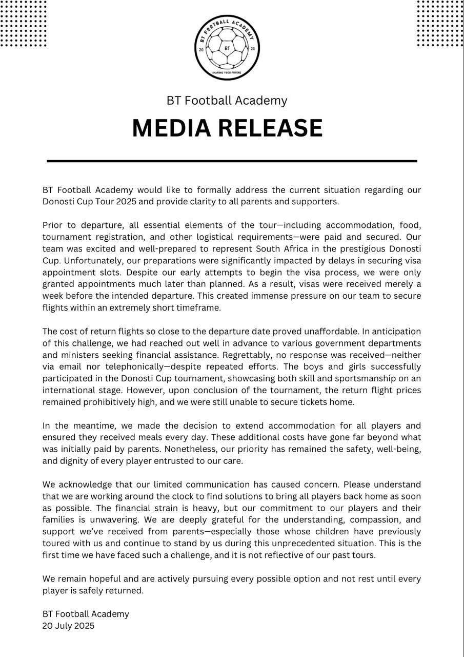 According to a statement released by BT Football Academy, the purchase of a ticket for a return flight was delayed due to visa delays, which, in turn, made flights more expensive than anticipated.