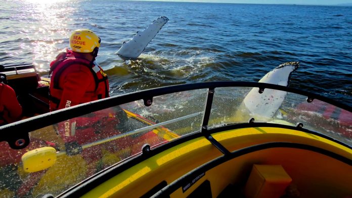 NSRI coxswain Gerhard Visagie carefully brought the rescue craft alongside the whale while the crew began cutting the rope, taking great care to avoid injuring the whale or putting themselves at risk.