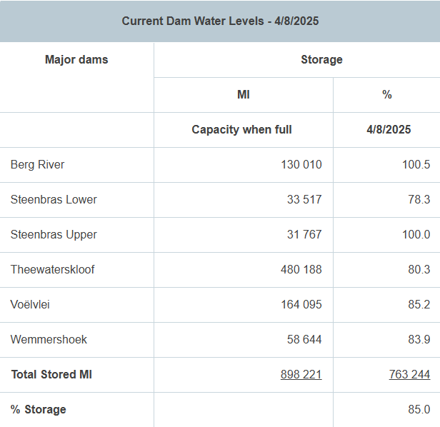 - Winter Rains in late June to early July caused a notable recovery in dam levels. The system rose from 60,71 % (Week 23) to 83,17 % (Week 30).