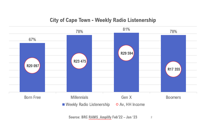 And the epicentre of that listening distribution curve is the economically active Generation X market segment. Generation X has the highest Av. HH Income of all the generational cohorts in Cape Town and 81% listen to radio.