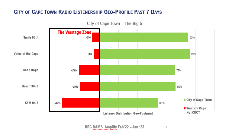 When we isolate the top 5 local radio stations in the City of Cape Town and evaluate that audience relative to the rest of Western Cape, we can see that a station like Smile FM has only a 7% overspill into the Western Cape. For advertisers targeting the City of Cape Town, make sure you get what you pay for. And even more importantly, make sure you only pay for what you want.