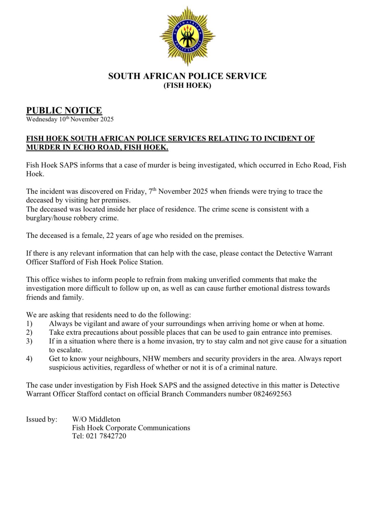 “The Fish Hoek CPF once again appeals to the community to refrain from speculation or sharing unverified information that could hinder the investigation or cause further distress to the victim’s family and friends,” said CPF chairperson, Andre Blom, on social media.